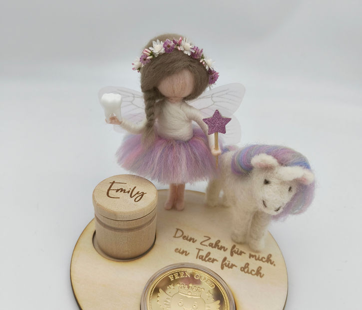 Die Zahndose wird mit dem Vornamen graviert und der Holzteller passt wahlweise für eine 2€ Münze oder eine goldene Feen-Gold-Münze (die du auch gleich mit bestellen kannst).